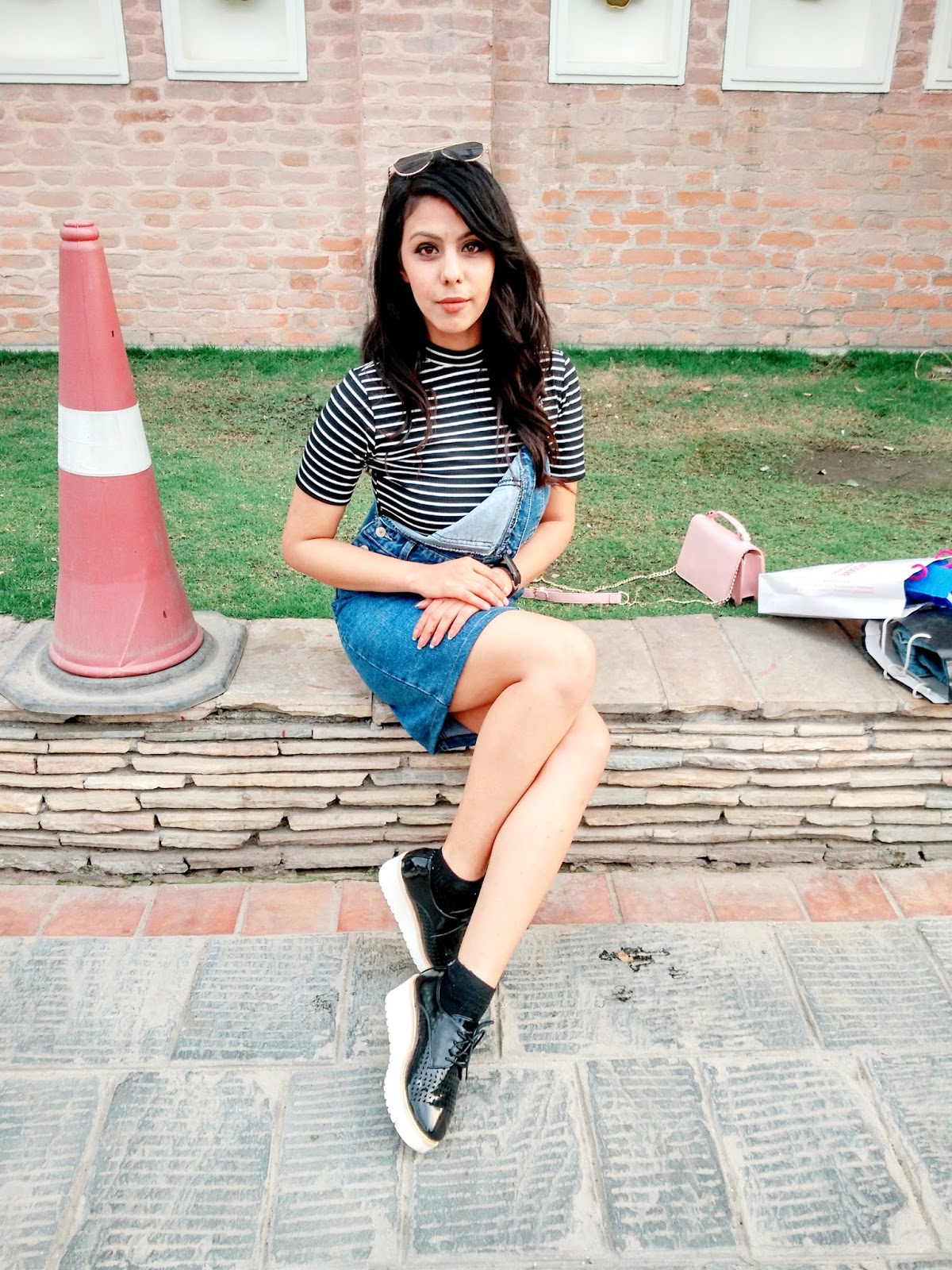 Hello people! Its Friday and I'm back with another post. If you are following me on Instagram you may have already seen a few of these pictures. For this look I've styled the most basic pieces which probably all of you have in your wardrobe. I wore this turtleneck black n white stripe t-shirt with dark blue dungaree skirt. Dungarees also known as overalls made a huge comeback in 2015 and are trending since then. You can pair them with almost any kind of t-shirt and they'll still look cute. For the shoes I wore these black patent flatform laceups that are almost identical to the Stella McCartney ones. To keep it minimal just grabbed these double golden rimmed shades and this black Micheal Kors watch.